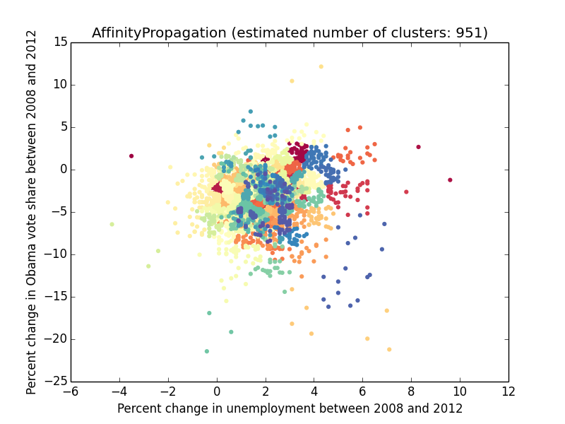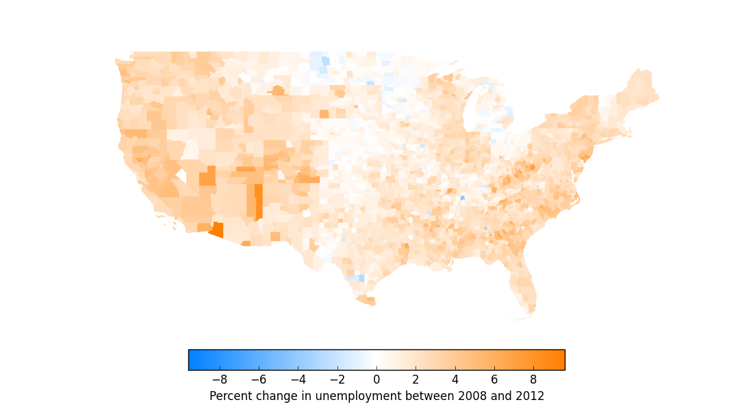 The job market obviously hasn’t been too great the past couple of years. I hurried off to the welcoming arms of grad school soon after the news media started throwing around the phrase “The Great Recession”, which sounds like a way of saying, “We aren’t actually telling you to panic, but if we can spook you into watching more CNN coverage that’d be great.” And it’s no secret that Obama’s approval ratings haven’t fared so well either: apparently they keep hitting new and exciting record lows. So this got me wondering: how much do people blame the President for a stalling economy? This is a hard question to precisely answer (correlation having a pesky habit of not equaling causation and all), but we can pose the problem in a simpler way: do areas that experience increased unemployment also tend to increase their disapproval of Obama? Fortunately, this is a more answerable question. We have yearly data of unemployment rates on the county level, and we also have county-level voter data from US presidential elections. With these datasets, we can determine whether there exists a correlation between the change in unemployment between 2008 and 2012 and the change in the percentage of Obama voters between the presidential elections in those two years. (Plus, these datasets give me a flimsy excuse to learn how to work with pandas for Python.)